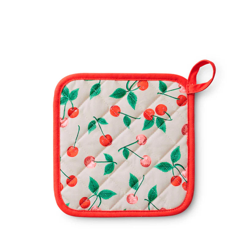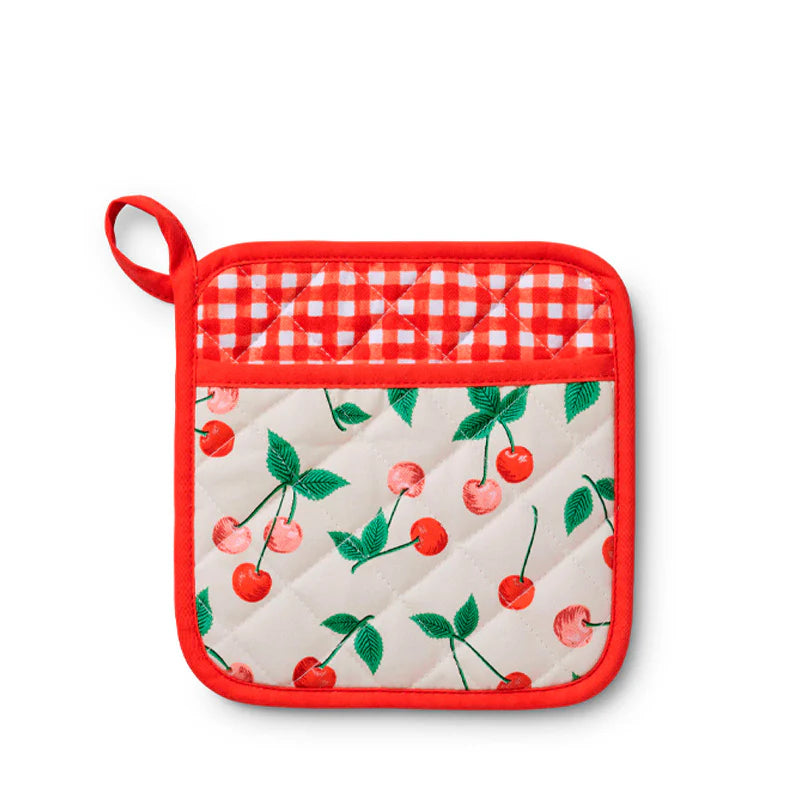 Yes, chef! Protect your hands from hot pans with this quilted pot holder with contrast piping, a pocket for your hand, and a corner loop for hanging.